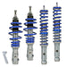 Suspension combiné fileté BlueLine Réglables Compatible av. Polo 6N Facelift Variant 99-02 (6N/2) Tuning Kit Complet - Qualité Allemande Plage de réglage avant / Arriére 40-55 mm Charge maximale supportée par les essieux: Essieu avant 900 Kg / Arriére 810 Kg Ressorts enroulés à froid - Revêtement par poudre EPS - Amortisseurs galvanisés
